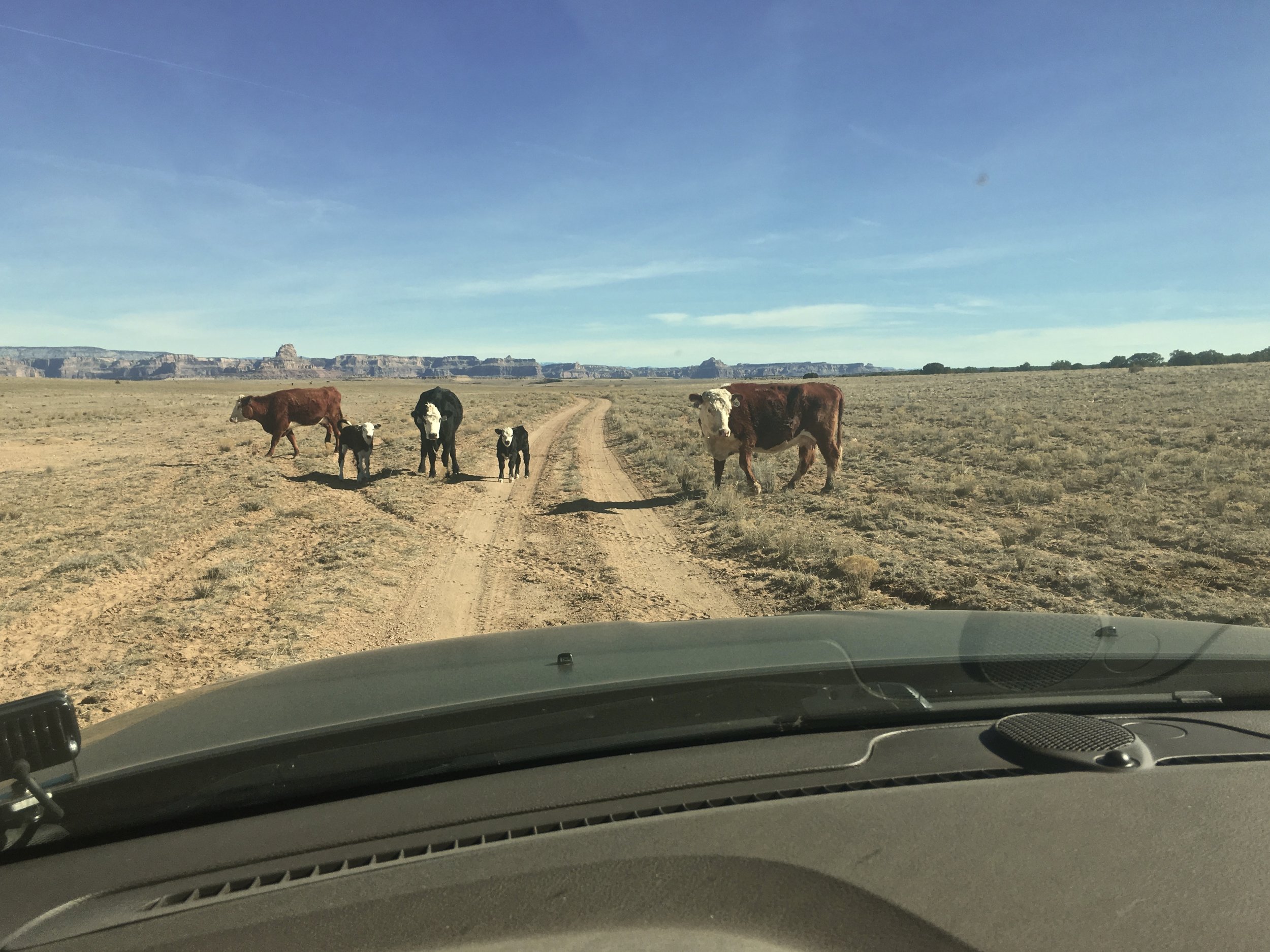 We woke up pretty early on Day 2 even though curious cows had woke us and the wolfdog in the middle of the night. The spectacular iconic vistas all around Oil Well Flat are straight out of an old western movie. The goal was to reach and complete the Devil's Racetrack, but we were taking a roundabout way in order to see some more pictograms. The shortcut would have been to cross "Fix-it" pass and head straight to the Devil's Ractrack, but we got to cross a lot of open country instead and see some ancient rock art.