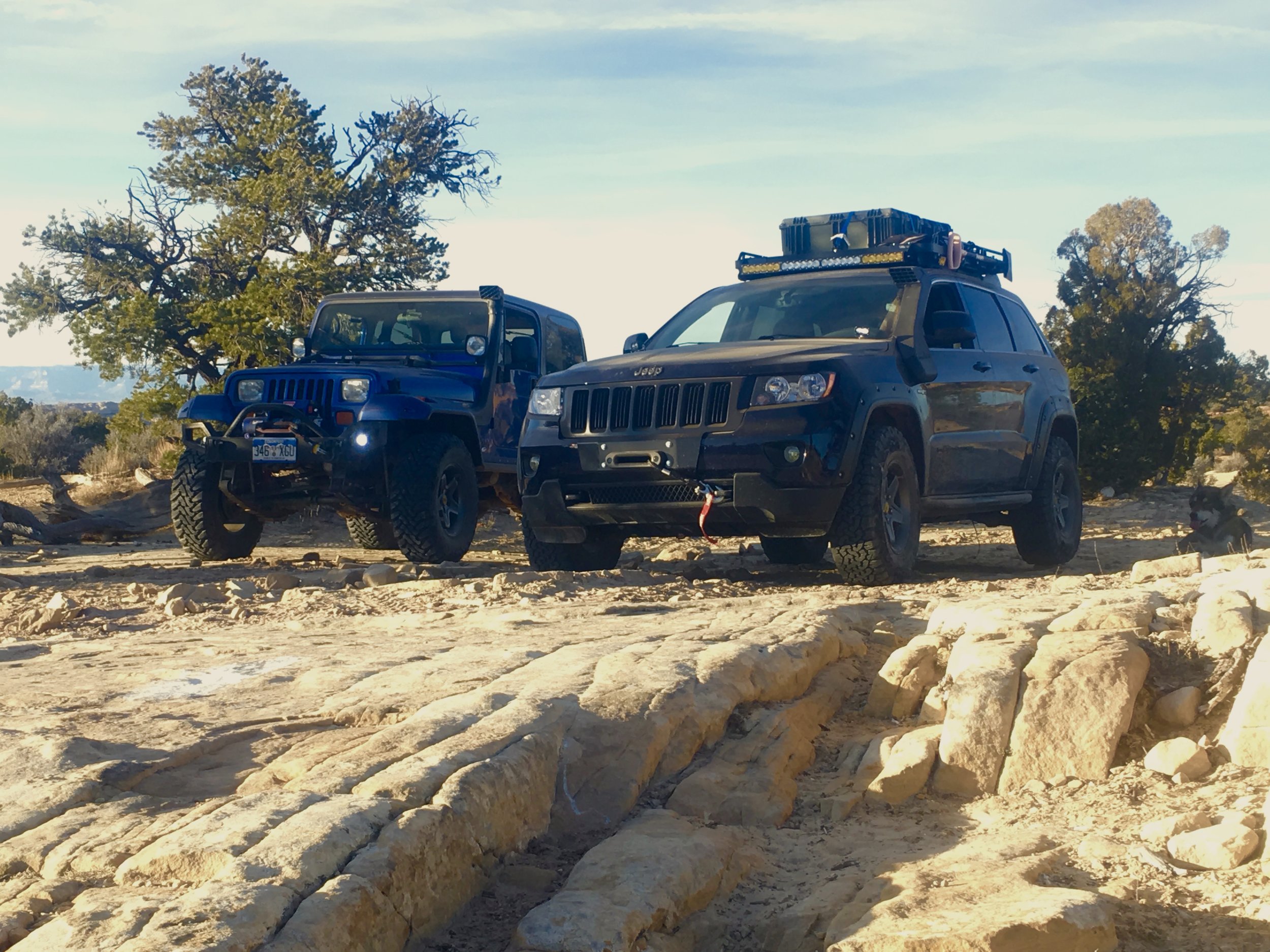 The Devil's Racetrack is one of the premier technical routes in the San Rafael Swell, crossing a wilderness study area. Most of the trail is rather mild with some rock crawling, but the "racetrack" section has large ledges, offset broken slickrock, and a narrow off-camber path between two large drop-offs. Greer was getting confident and tackled this BLM black rated route like a rock star. The Grand Cherokee had some challenges, but also successfully tackled some large obstacles with aplomb and no winching required. The sun was setting, and we finished the trail in the dark before settling on a campsite in sight of Ghost Rock on the south side of I-70.
